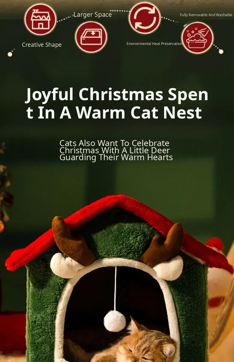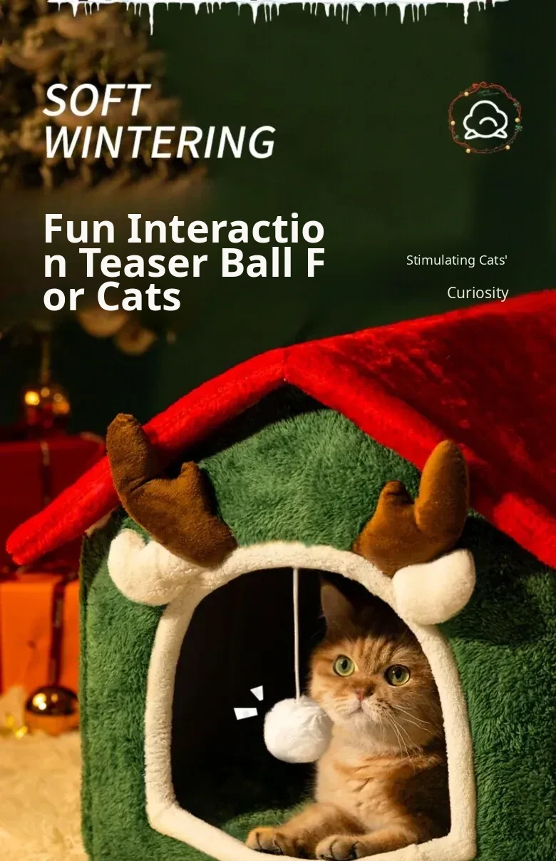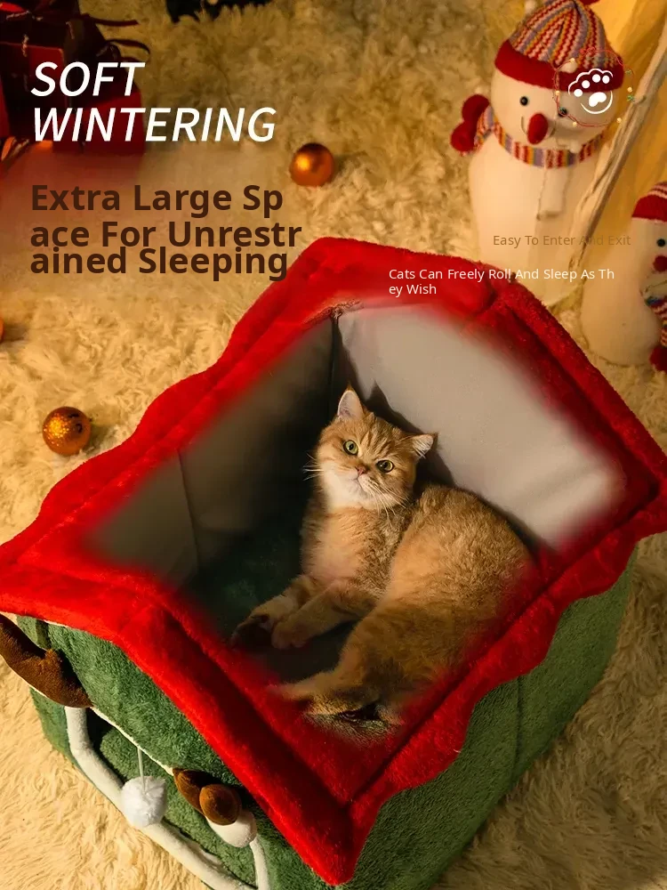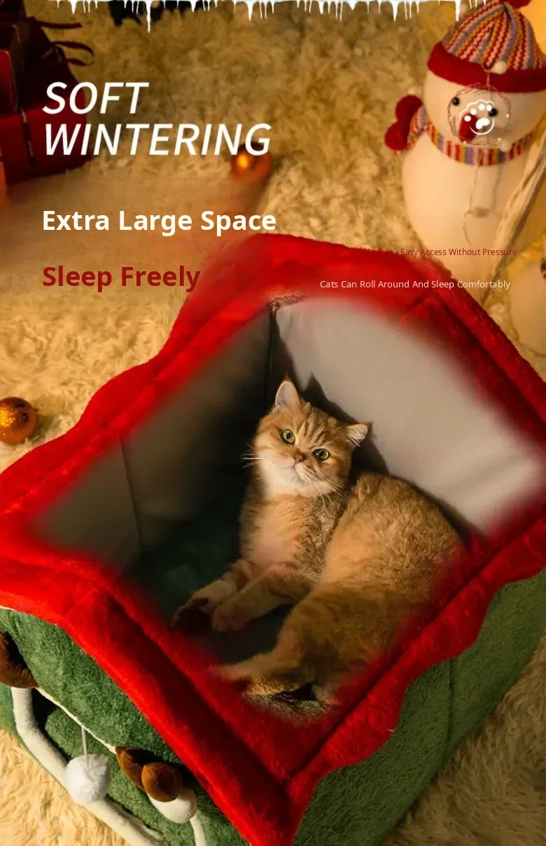 Cozy Enclosed Christmas Cat Bed - Winter Warmth & All-Season Comfort for Your Feline Friend's Safety and Happiness