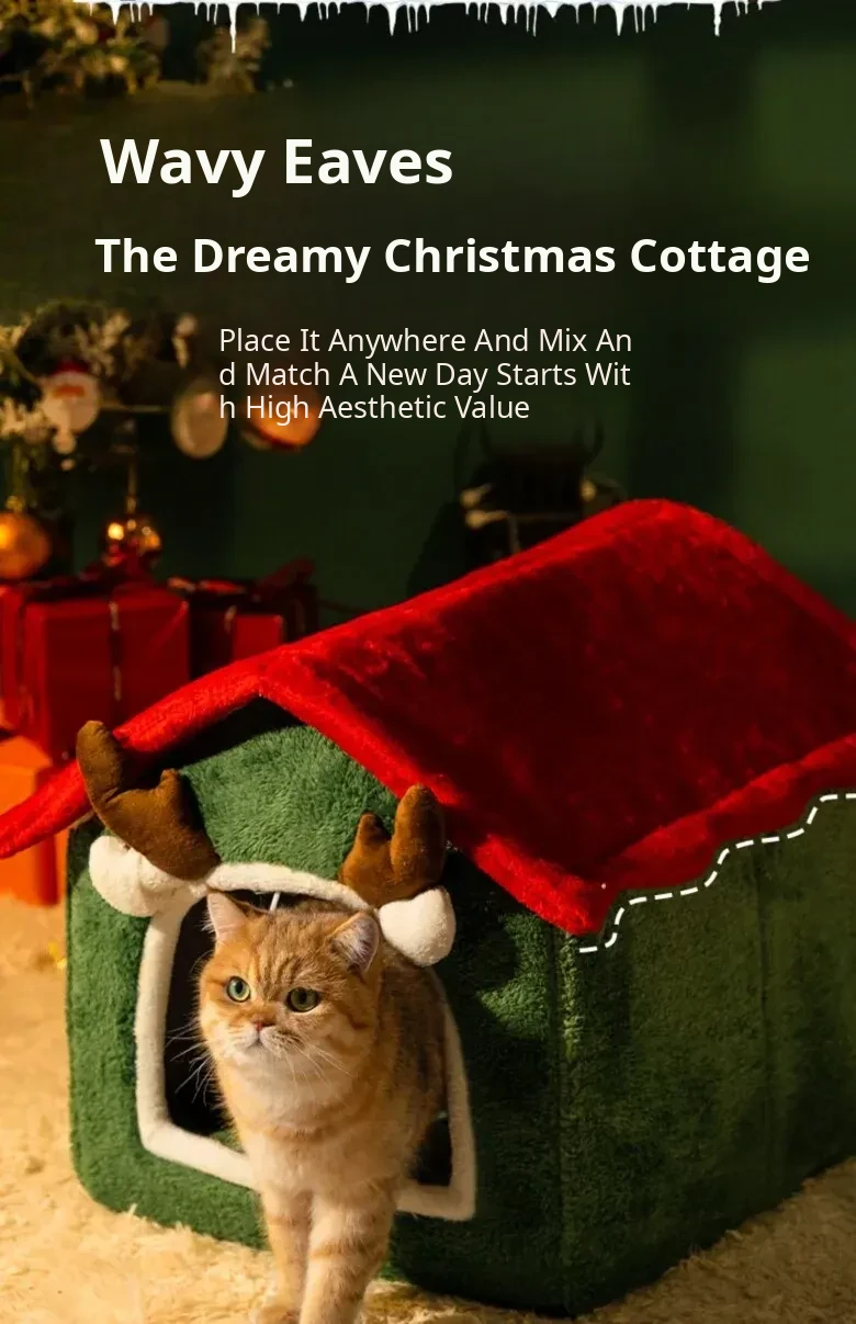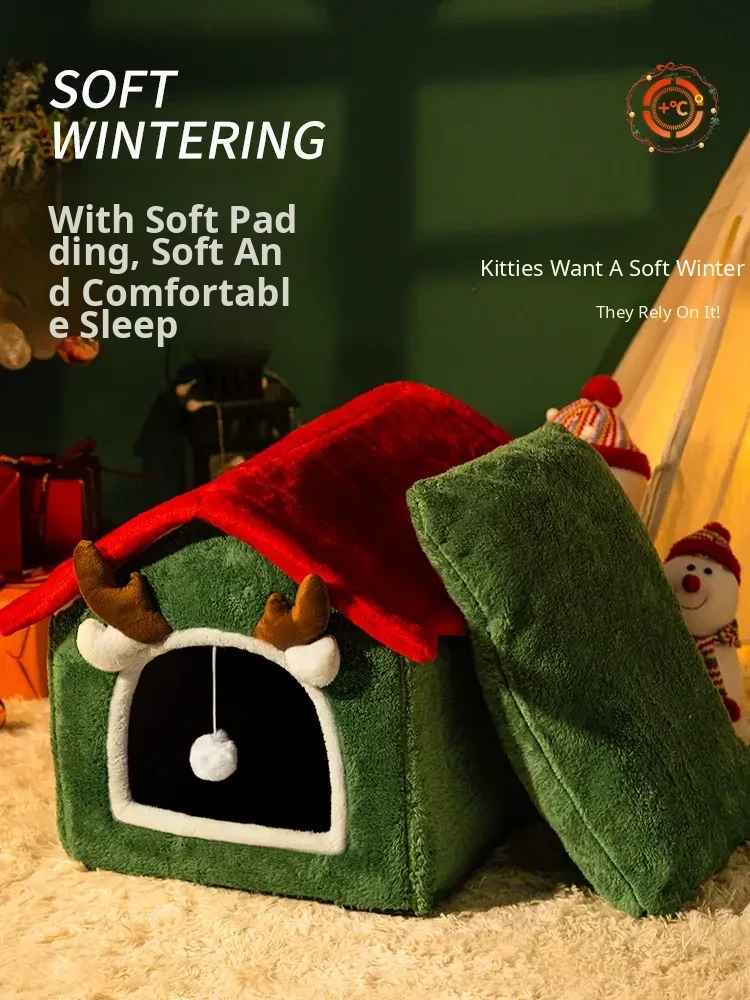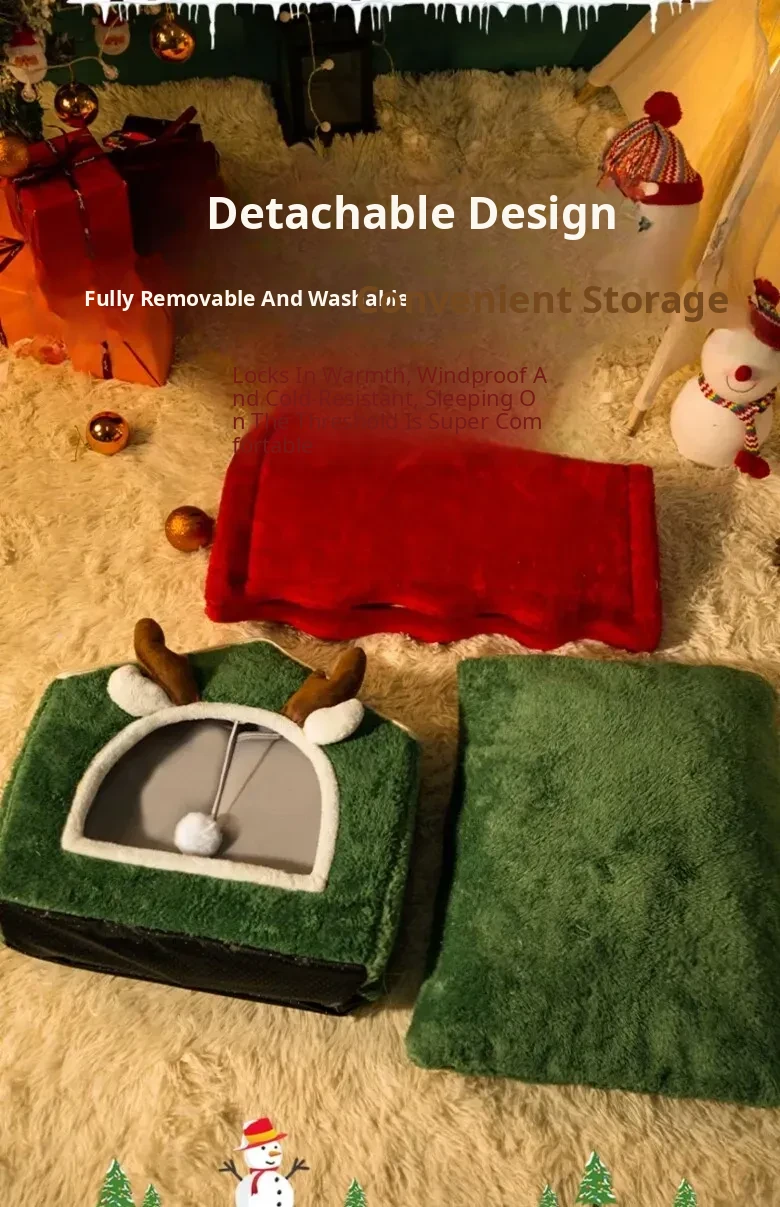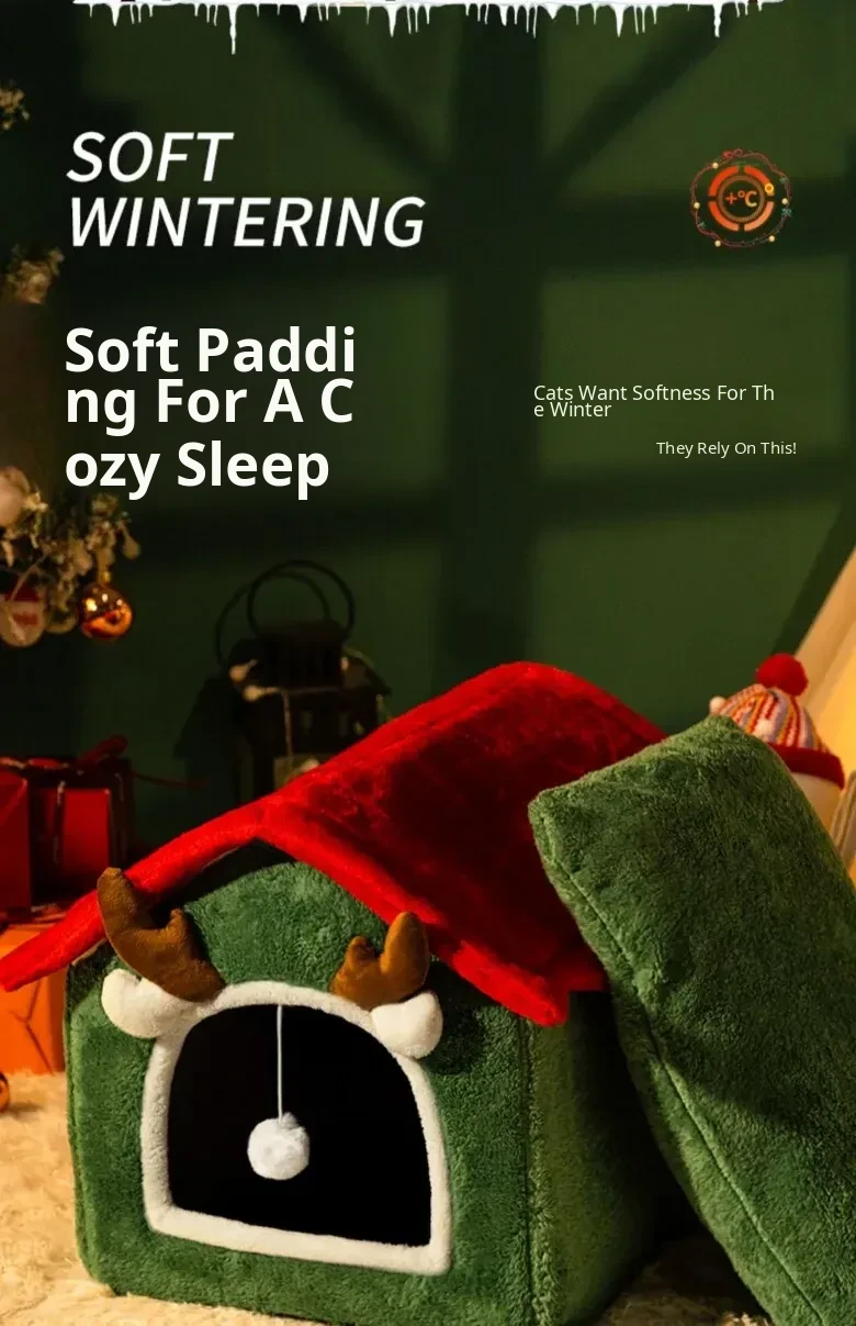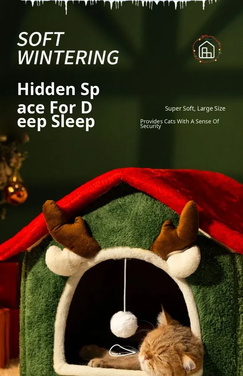 Cozy Enclosed Christmas Cat Bed - Winter Warmth & All-Season Comfort for Your Feline Friend's Safety and Happiness