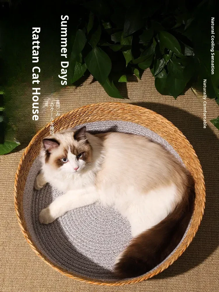 Summer Rattan Cat Bed - Stylish and Versatile Rattan Sleeping Nest for Cats, Perfect for All Seasons, Ideal Cozy Retreat for Your Feline Friend