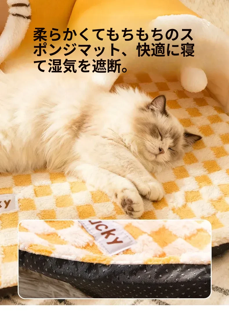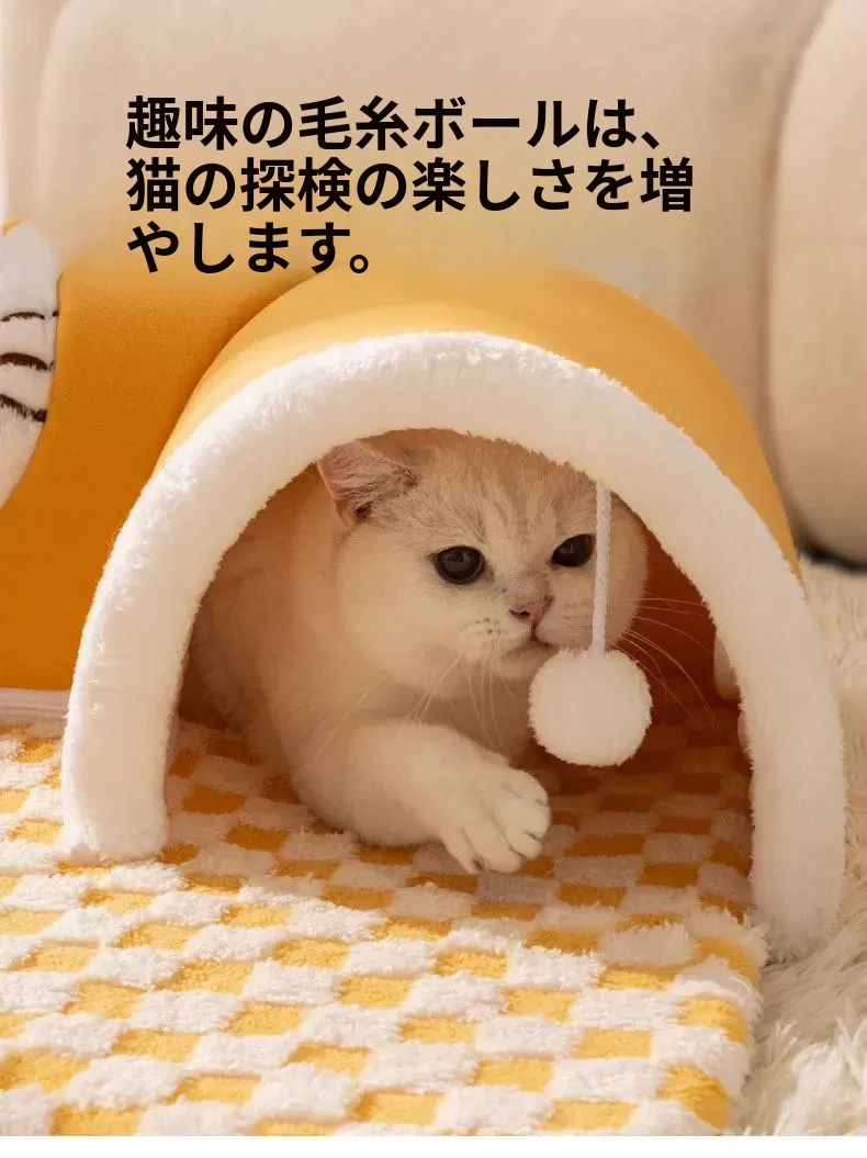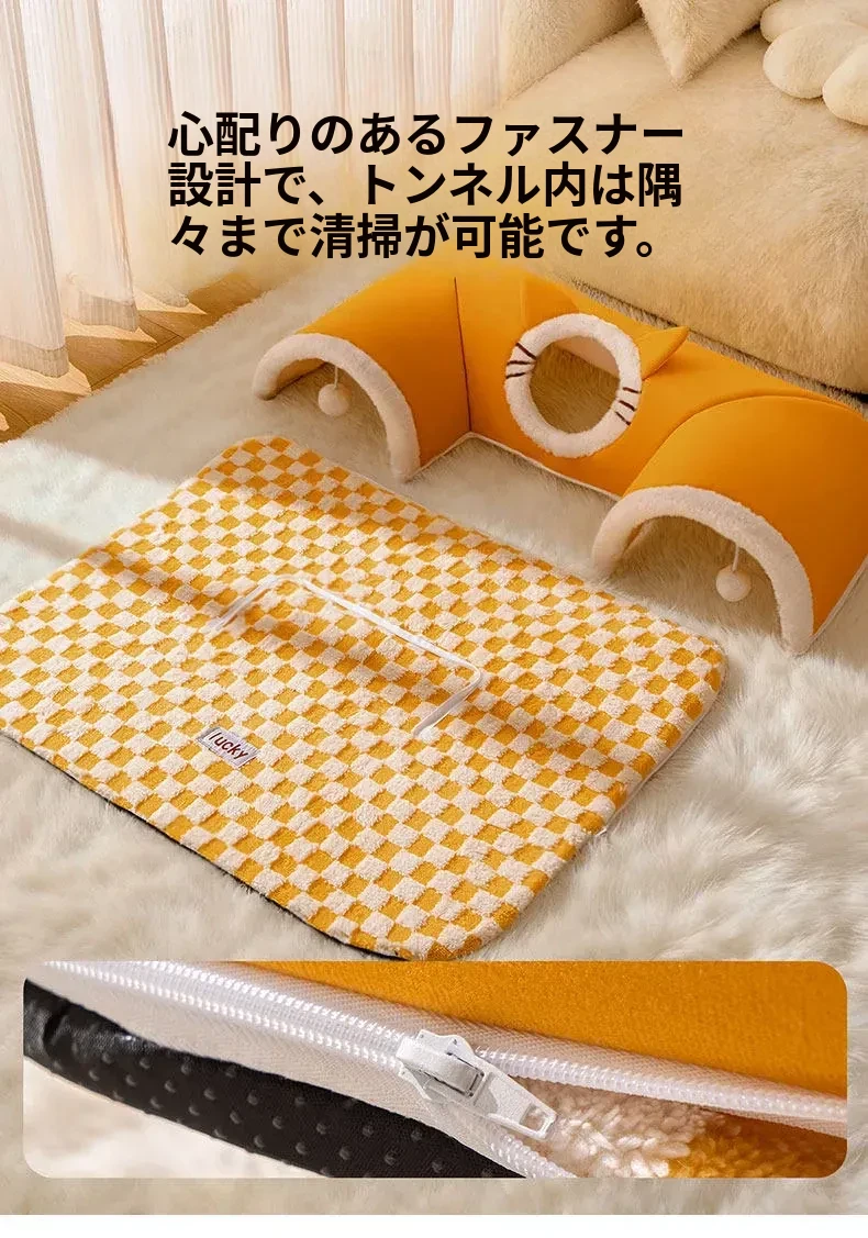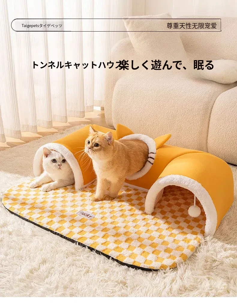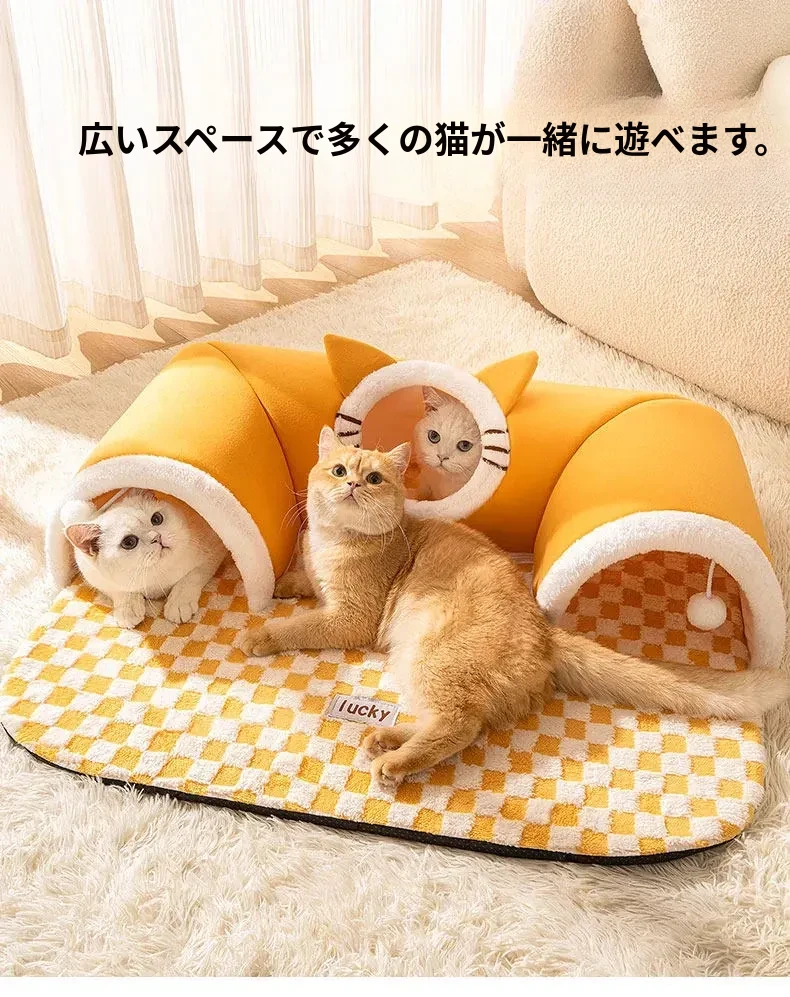 四季使える猫の隠れ家トンネル!冬の寒さから守る暖かい閉じ込め空間で、安心感を与える多頭飼いにも最適な猫用マット付き。あなたの猫ちゃんに最高の居場所を提供します!