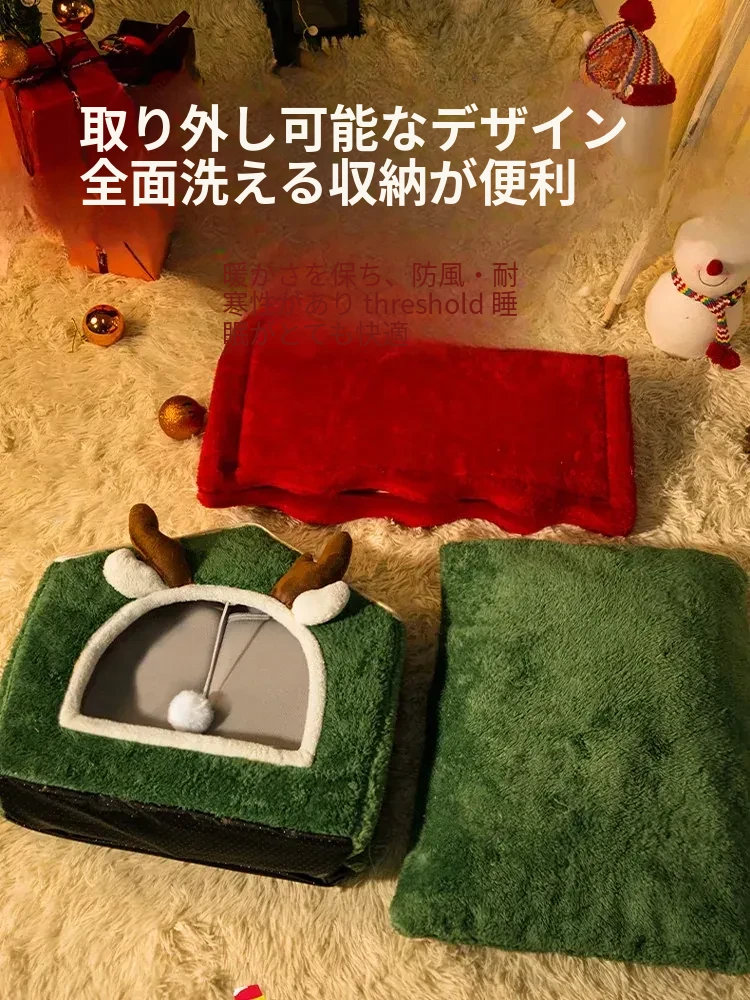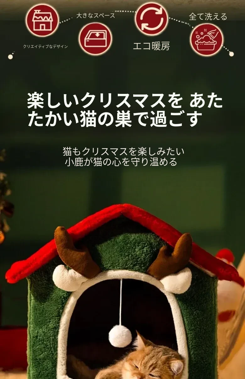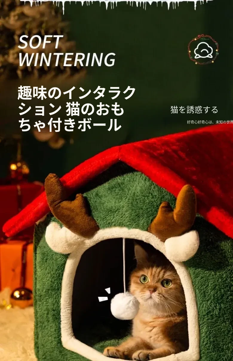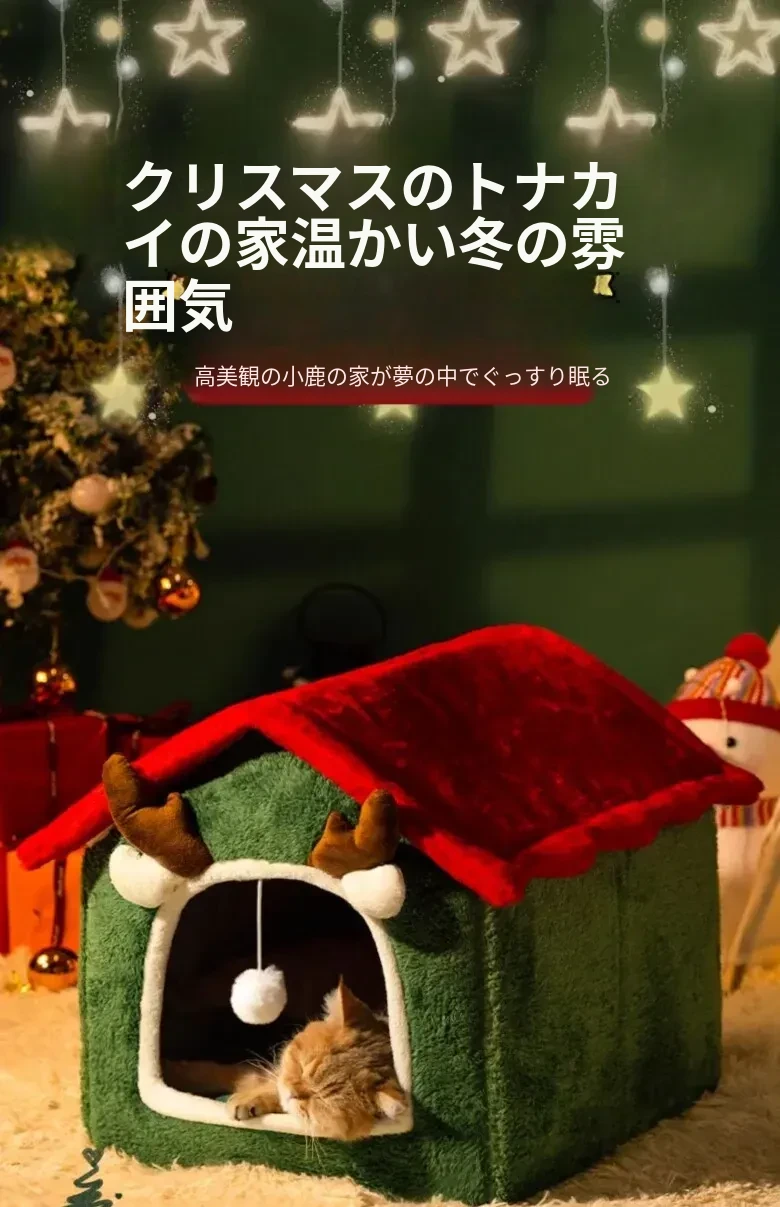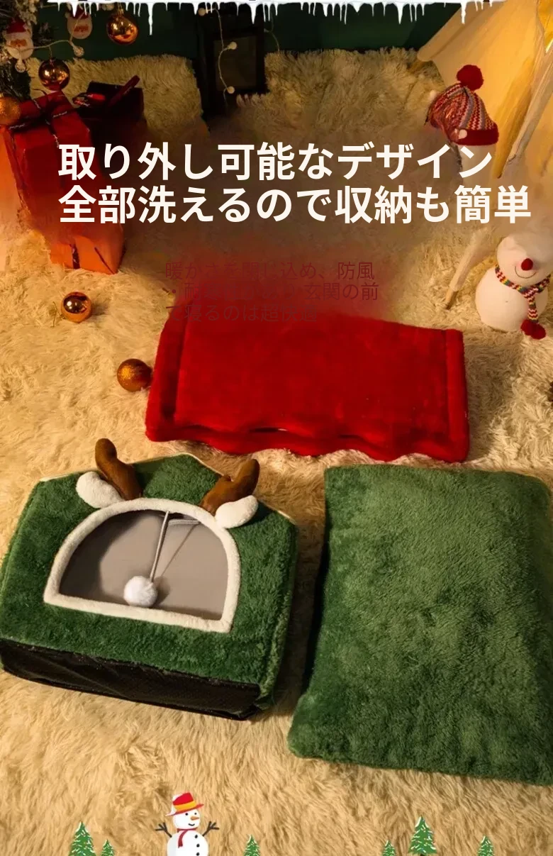 フリース厚手クリスマスキャットハウス#赤い角のトナカイ