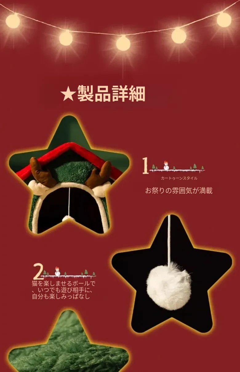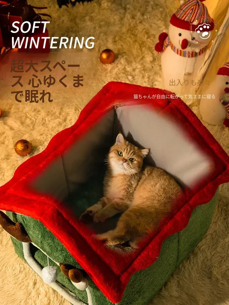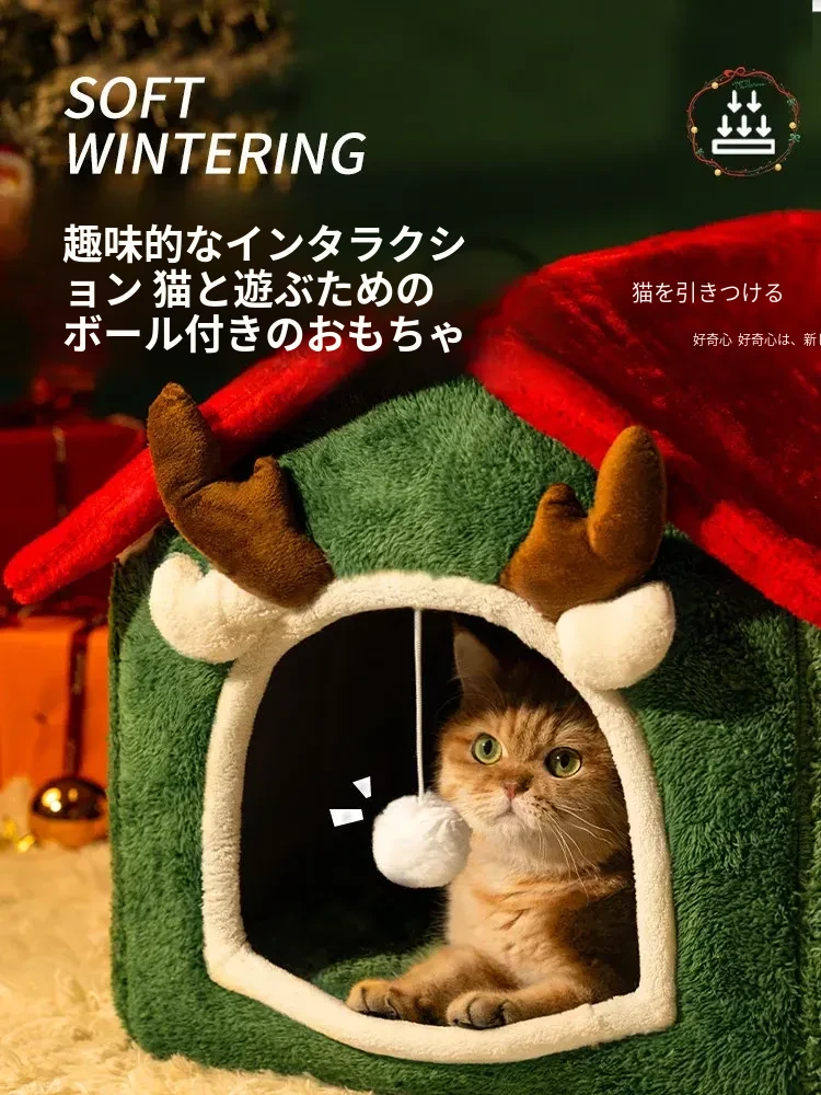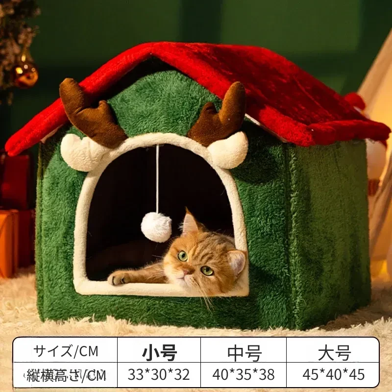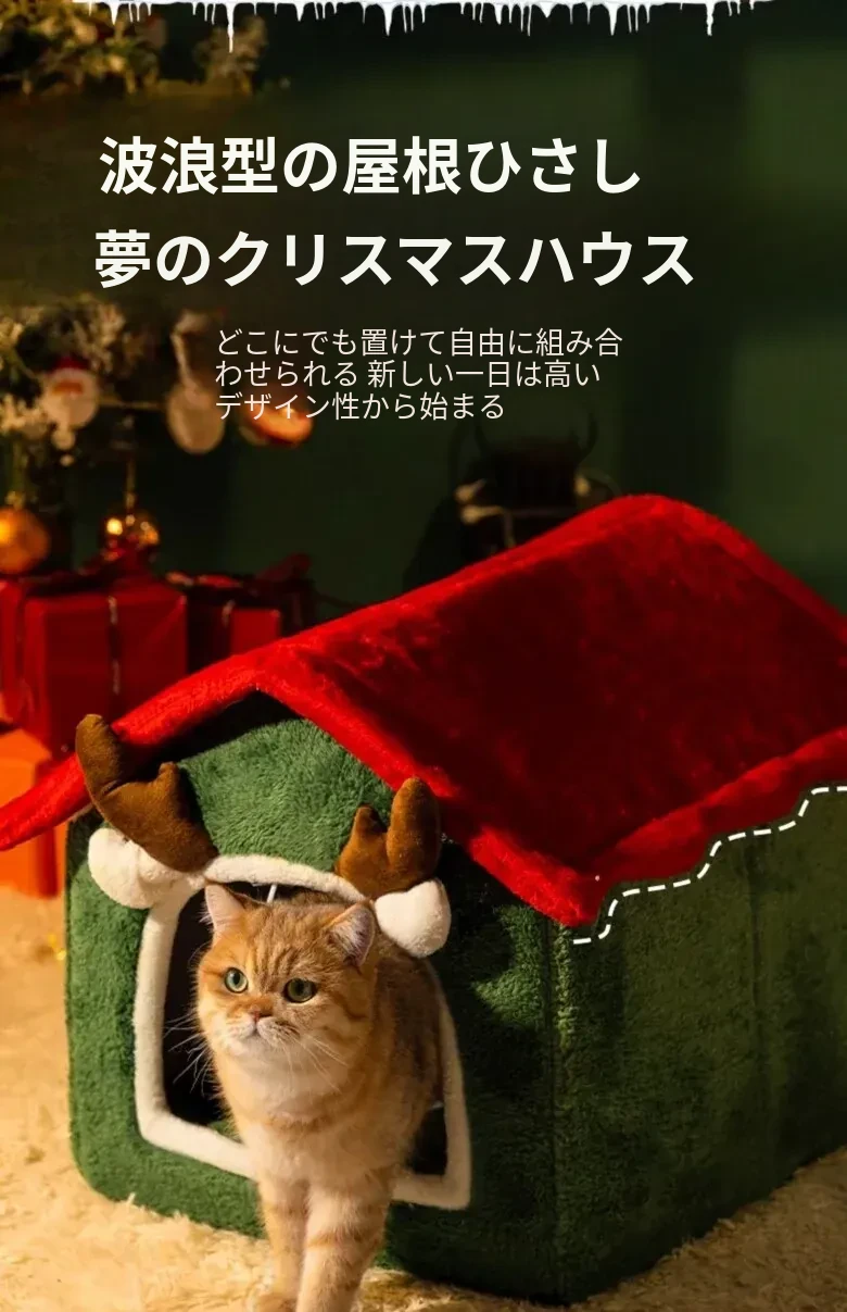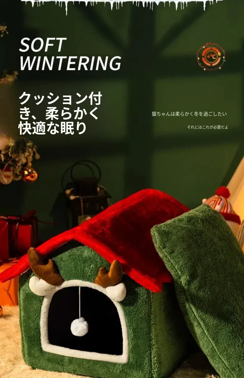 フリース厚手クリスマスキャットハウス#赤い角のトナカイ