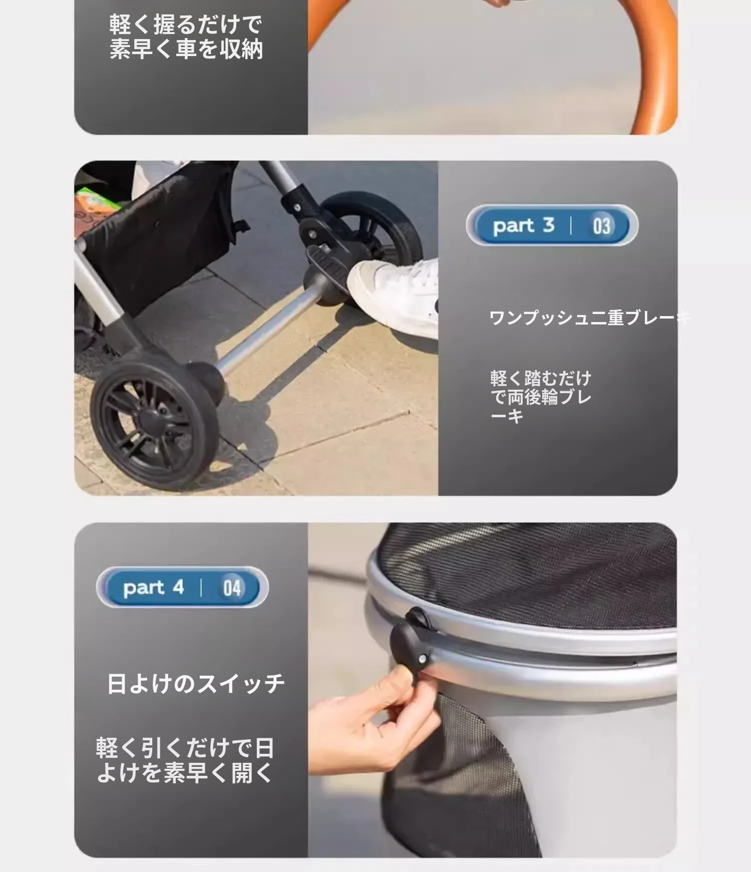 灰色(ワンボタン収納+トレイ+両方向日よけカーテン)耐荷重40ポンド