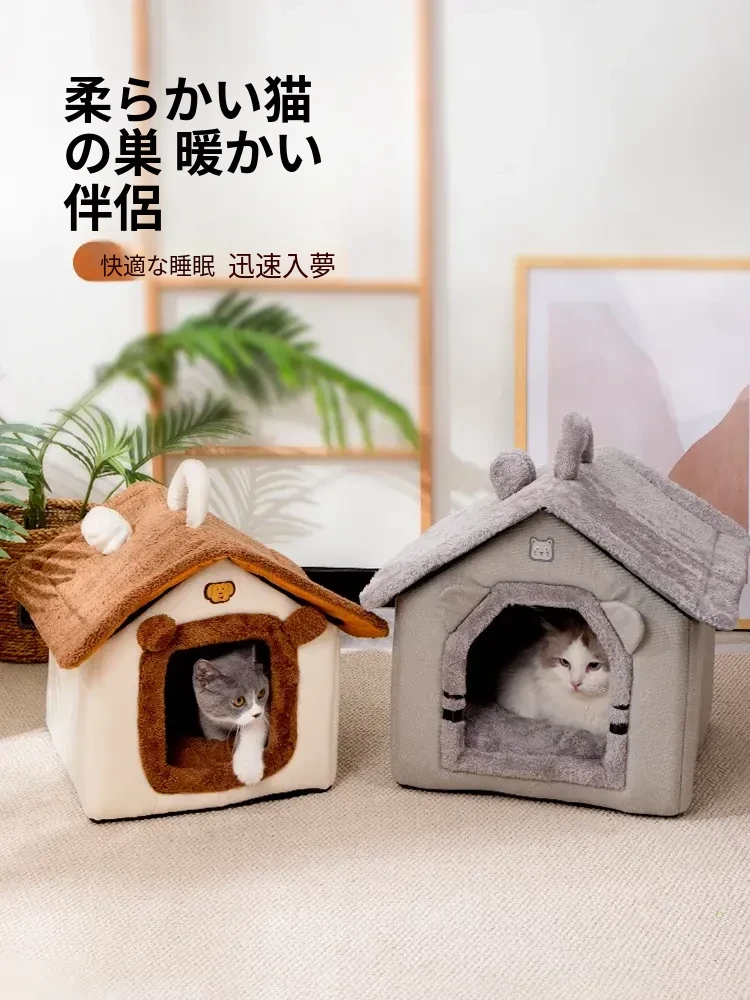 冬の寒さから守る!厚手の保温半封閉型キャットハウス - 四季通用、愛猫の安全と快適さを提供する新しい寝床!