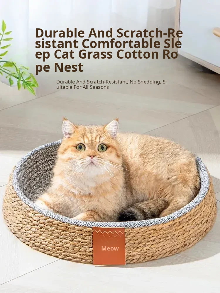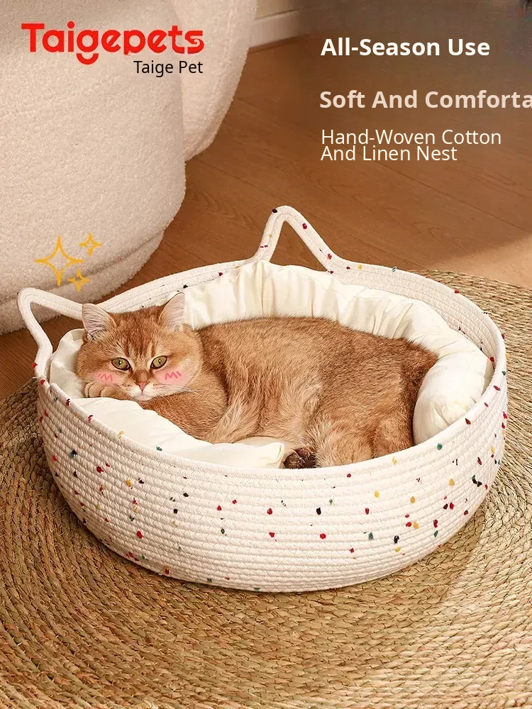 All-Season Cat Bed: Handmade Woven Rattan Cat Scratching Post with Removable Washable Cushion for Winter Warmth and Summer Coolness - Perfect for Kittens and Cats!