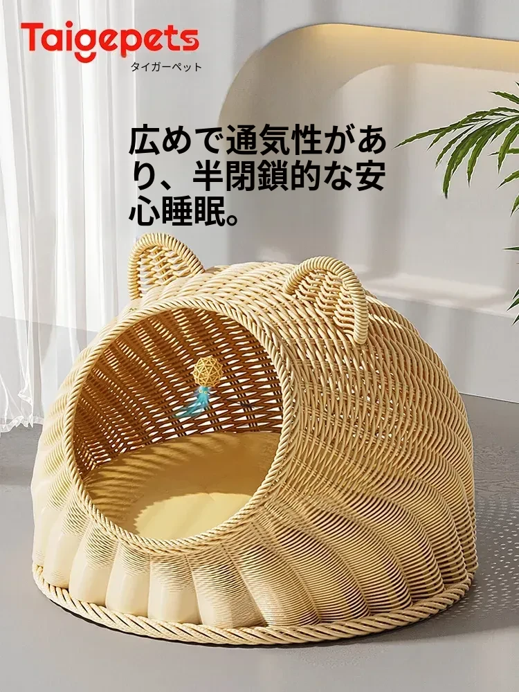 立体型で崩れない!四季対応の藤製キャットハウス。冬の寒さをしっかり防ぎ、安心感を与える半封閉デザイン。猫の出入りもスムーズなドア付き。洗えるからいつでも清潔!