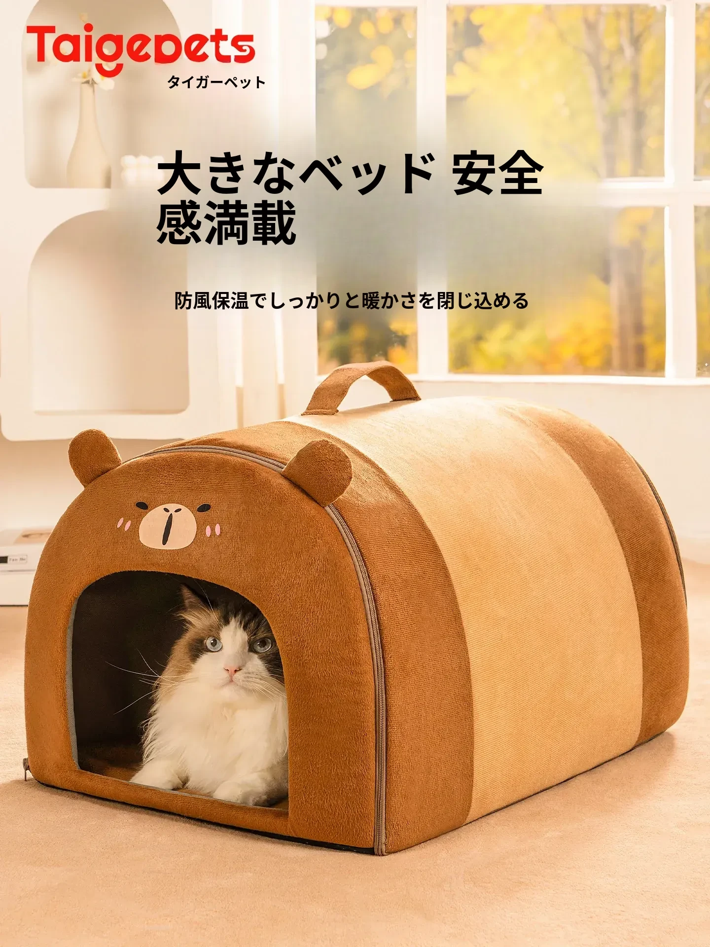 カピバラの冬用キャットハウス|安心感を与える厚手で保温性抜群!洗濯可能な封閉型デザインで、四季に対応した犬のための快適な住まい。