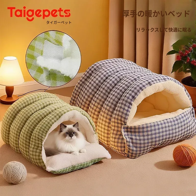 冬に最適!暖かい半封閉式の猫ハウス - 洗えるデザインで一年中使える!愛猫や子猫のための快適なベッド、犬にもぴったり。